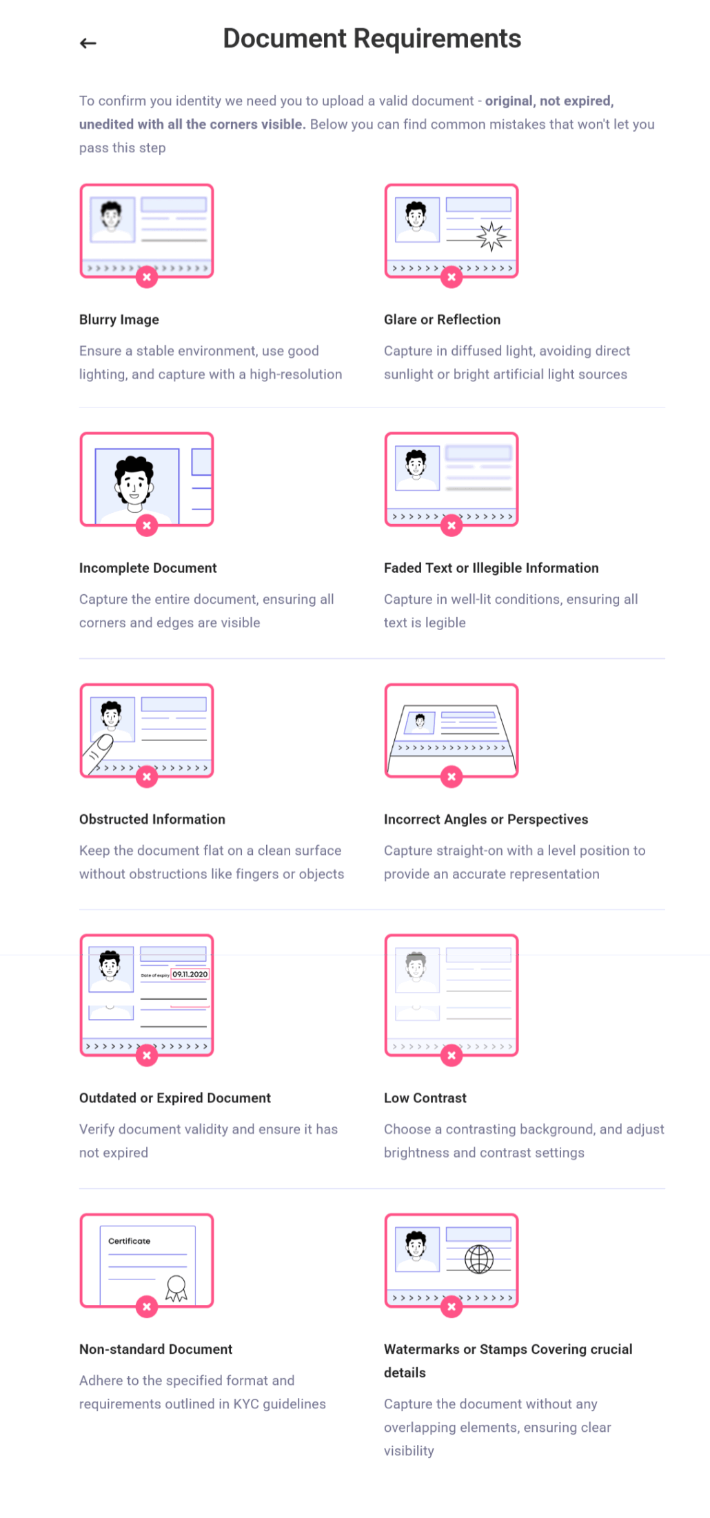 To proceed, please present a valid identity document that meets the following criteria: