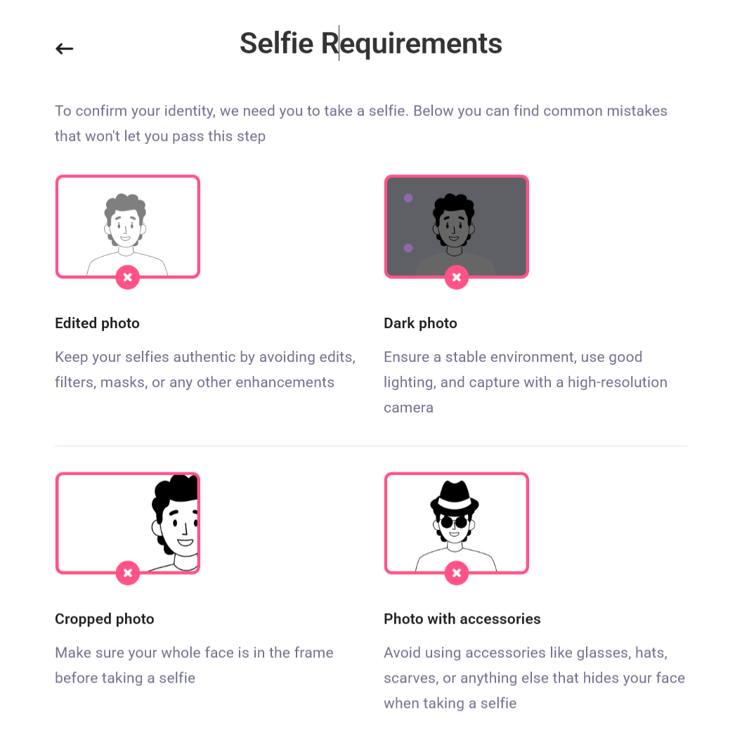 To confirm an identity, we need a selfie. Below you can find common mistakes that won’t let you pass this step.