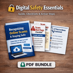 - Printable PDF explaining common online scams (phishing, fake marketplaces, identity theft).
